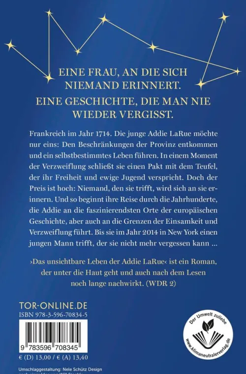 Addie LaRue ist die Frau, an die sich niemand erinnert. Die unbekannte Muse auf den Bildern Alter Meister. Die namenlose Schönheit in den Sonetten der Dichter. Dreihundert Jahre lang reist sie durch die europäische Kulturgeschichte – und bleibt dabei doch stets allein.