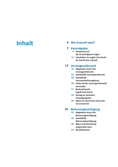 In diesem Buch werden Ihnen alle Fragen zum Thema Vorsorge beantwortet, sodass Sie ohne Unsicherheiten die wichtigsten Vorkehrungen treffen können. Der Ratgeber beinhaltet alle wichtigen Formulare mit Ausfüllhilfen, die Sie zusätzlich herunterladen können. Alle Begriffe und Vorgehensweisen werden Ihnen in diesem Leitfaden so verständlich wie möglich erklärt, um die verschiedenen Schritte zu Ihrer Vorsorge so unkompliziert wie möglich zu gestalten.