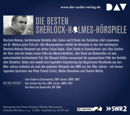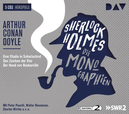 Sherlock Holmes, berühmtester Detektiv aller Zeiten und Erfinder der Deduktion, klärt zusammen mit Dr. Watson jeden Fall auf. »Sherlock Holmes 1 – Die Monographien« enthält die Hörspiele zu den drei wichtigsten Sherlock-Holmes-Romanen von Arthur Conan Doyle. »Eine Studie in Scharlachrot« und »Das Zeichen der Vier« sind die beiden ersten Fälle des Meisterdetektivs, »Der Hund von Baskerville« ist sein wahrscheinlich berühmtester Fall. Die neu zusammengestellten Hörspielboxen versammeln mehr als drei Dutzend spannende Fälle des legendären Ermittlers. So sind alle Hörspiele des Bayerischen Rundfunks aus den 60er-Jahren mit Peter Pasetti als Sherlock Holmes enthalten – für viele Fans die besten Doyle-Hörspiele überhaupt -, aber auch die opulenten Inszenierungen des SWR aus den 90er-Jahren mit Walter Renneisen und anderen herausragenden Sprechern. Die Box enthält: – Eine Studie in Scharlachrot, SWF (heute SWR) 1987 – Das Zeichen der Vier, SWF (heute SWR) 1991 – Der Hund von Baskerville, BR 1966Hörspiel mit Peter Pasetti, Walter Renneisen, Charles Wirths5 CDs | ca. 4 h 57 min CD Standard Audio Format