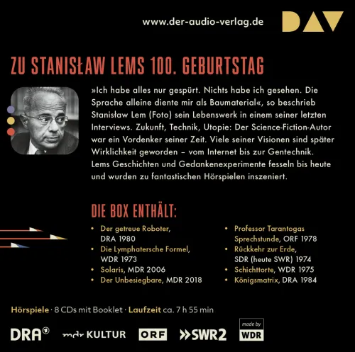 Zukunft, Technik, Utopie: Der Science-Fiction-Autor Stanislaw Lem war ein Vordenker seiner Zeit. Viele seiner Zukunftsvisionen wurden später Wirklichkeit – vom Internet bis zur Gentechnik. Lems Geschichten und Gedankenexperimente fesseln bis heute. In „Solaris“ sucht Kris Kelvin die Besatzung einer Forschungsstation auf und muss sich bald nach seiner Ankunft mit dem intelligenten Planeten Solaris auseinandersetzen. In „Der getreue Roboter“ wird gegen einen durch künstliche Intelligenz zum Mörder gewordenen Roboter ermittelt. Die spannend inszenierten Hörspiele über fremde Welten erstmals in einer Box! Hörspiel mit Gert Westphal, Felix von Manteuffel, Maria Simon8 CDs | ca. 7 h 53 min CD Standard Audio Format. Hörspiel