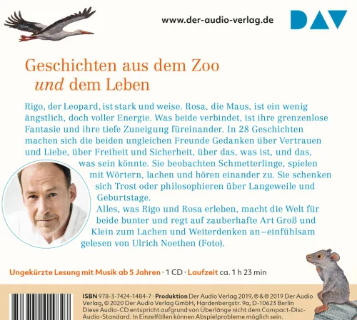 Rigo, der Leopard, ist stark und weise. Rosa, die Maus, ist ein wenig ängstlich, jedoch voller Energie. Was beide verbindet, ist ihre grenzenlose Fantasie und ihre tiefe Zuneigung füreinander. In 28 Geschichten machen sich die beiden ungleichen Freunde Gedanken über Vertrauen und Liebe, über Freiheit und Sicherheit, über das, was ist, und das, was sein könnte. Sie beobachten Schmetterlinge, spielen mit Wörtern, lachen und hören einander zu. Sie schenken sich Trost oder philosophieren über Langeweile und Geburtstage. Alles, was Rigo und Rosa erleben, macht die Welt für beide bunter und regt auf zauberhafte Art Groß und Klein zum Lachen und Weiterdenken an. Ungekürzte Lesung mit Musik mit Ulrich Noethen1 CD | ca. 1 h 23 min CD Standard Audio Format