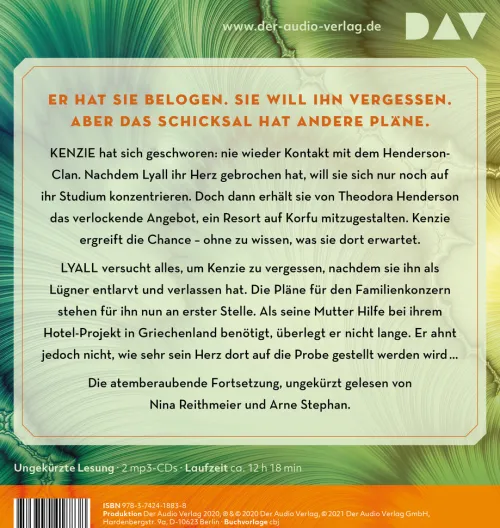 Kenzie hat sich geschworen: nie wieder Kontakt mit dem Henderson- Clan. Nachdem Lyall ihr Herz gebrochen hat, will sie sich nur noch auf ihr Studium konzentrieren. Doch dann erhält sie von Theodora Henderson das verlockende Angebot, ein Resort auf Korfu mitzugestalten. Kenzie ergreift die Chance – ohne zu wissen, was sie dort erwartet. Lyall versucht alles, um Kenzie zu vergessen, nachdem sie ihn als Lügner entlarvt und verlassen hat. Die Pläne für den Familienkonzern stehen für ihn nun an erster Stelle. Als seine Mutter Hilfe bei ihrem Hotel-Projekt in Griechenland benötigt, überlegt er nicht lange. Er ahnt jedoch nicht, wie sehr sein Herz dort auf die Probe gestellt werden wird. . . Die atemberaubende Fortsetzung, ungekürzt gelesen von Nina Reithmeier und Arne Stephan. Ungekürzte Lesung mit Nina Reithmeier, Arne Stephan2 mp3-CDs | ca. 12 h 18 min