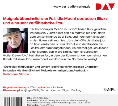 Maigrets übersinnlichster Fall: die Macht des bösen Blicks und eine sehr verführerische Frau. Der Fischdampfer Océan muss vom bösen Blick getroffen worden sein: Zuerst bricht sich ein Matrose ein Bein, dann geht ein Schiffsjunge über Bord, und dann stellt man fest, dass die Hälfte des Kabeljaus verdorben ist. Kurz darauf wird der Kapitän des Schiffes ermordet aufgefunden. Ein alter Schulfreund bittet Maigret, sich in die Ermittlungen einzuschalten. Kurzerhand verlegt der Kommissar den gemeinsamen Urlaub mit seiner Frau vom Elsass in die Normandie. Maigrets 9. Fall spielt in Fécamp und Yport an der normannischen Küste. Ungekürzte Lesung mit Walter Kreye4 CDs | ca. 4 h 45 min