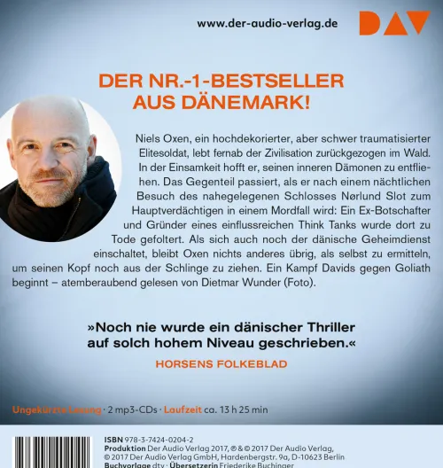 Niels Oxen, ein hochdekorierter, aber schwer traumatisierter Elitesoldat, lebt fernab der Zivilisation zurückgezogen im Wald. In der Einsamkeit hofft er, seinen inneren Dämonen zu entfliehen. Das Gegenteil passiert, als er nach einem nächtlichen Besuch des nahegelegenen Schlosses Nørlund Slot zum Hauptverdächtigen in einem Mordfall wird: Ein Ex-Botschafter und Gründer eines einflussreichen Think Tanks wurde dort zu Tode gefoltert. Als sich auch noch der dänische Geheimdienst einschaltet, bleibt Oxen nichts anderes übrig, als selbst zu ermitteln, um seinen Kopf noch aus der Schlinge zu ziehen. Ein Kampf David gegen Goliath beginnt. Ungekürzte Lesung mit Dietmar Wunder2 mp3-CDs | ca. 13 h 25 min Lesung