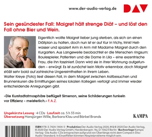 Sein gesündester Fall: Maigret hält strenge Diät – und löst den Fall ohne Bier und Wein. Eigentlich wollte Maigret lieber jung sterben, als sich an einen Diätplan zu halten, doch nun ist er auf Kur in Vichy, trinkt Heilwasser und spaziert Arm in Arm mit Madame Maigret durch den Kurgarten. Aus Langweile beobachtet er die Menschen ringsum: Boulespieler, Patienten und die Dame in Lila – eine exzentrische Frau, die ihn fasziniert. Dann wird sie in ihrer Wohnung aufgefunden – erwürgt. Und Maigret stößt sehr bald auf zahlreiche Ungereimtheiten in ihrem Leben. Maigrets 67. Fall spielt in Vichy. Ungekürzte Lesung mit Walter Kreye4 CDs | ca. 5 h 33 min