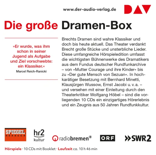 Brechts Dramen sind wahre Klassiker und doch bis heute aktuell. Das Theater verdankt Brecht große Stücke und unsterbliche Songs. Diese umfangreiche Hörspieledition umfasst die wichtigsten Bühnenwerke des Dramatikers aus dem Fundus deutscher Rundfunkarchive von »Mutter Courage und ihre Kinder« bis zu »Der gute Mensch von Sezuan«. In hochkarätiger Besetzung mit Bernhard Minetti, Klausjürgen Wussow, Ernst Jacobi u. v. a. – und versehen mit einer Einleitung durch den Theaterkritiker Wolfgang Höbel – sind die vorliegenden 10 CDs ein einzigartiges Hörerlebnis und ein Zeugnis aus 50 Jahren Rundfunkkultur. Hörspiel mit Bernhard Minetti, Klausjürgen Wussow, Ernst Jacobi10 CDs | ca. 10 h 46 min