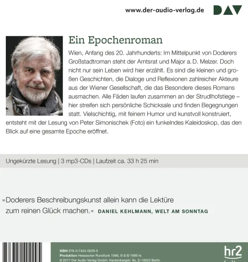 Wien, Anfang des 20. Jahrhunderts: Im Mittelpunkt von Doderers Großstadtroman steht der Amtsrat und Major a. D. Melzer. Doch nicht nur sein Leben wird hier erzählt. Es sind die kleinen und großen Geschichten, die Dialoge und Reflexionen zahlreicher Akteure aus der Wiener Gesellschaft, die das Besondere dieses Romans ausmachen. Alle Fäden laufen zusammen an der Strudlhofstiege – hier streifen sich persönliche Schicksale, finden Begegnungen statt und gehen wieder auseinander. Vielschichtig, mit feinem Humor und kunstvoll konstruiert, entsteht mit Simonischeks Lesung ein funkelndes Kaleidoskop, das den Blick auf eine gesamte Epoche eröffnet.