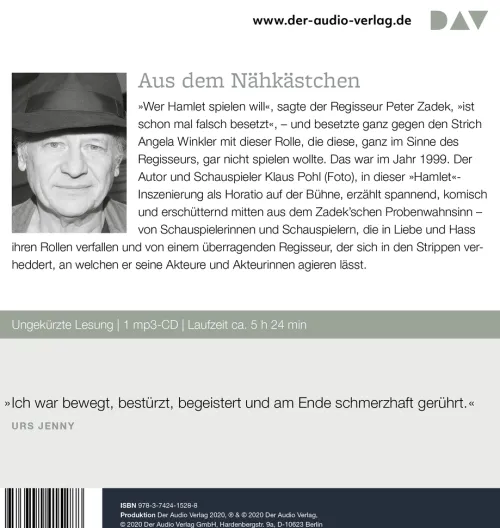 »Wer Hamlet spielen will«, sagte der Regisseur Peter Zadek, »ist schon mal falsch besetzt«, – und besetzte ganz gegen den Strich Angela Winkler mit dieser Rolle, die diese, ganz im Sinne des Regisseurs, gar nicht spielen wollte. Das war im Jahr 1999. Der Autor und Schauspieler Klaus Pohl, in dieser »Hamlet«-Inszenierung als Horatio auf der Bühne, erzählt spannend, komisch und erschütternd mitten aus dem Zadek’schen Proben-Wahnsinn – von Schauspielerinnen und Schauspielern, die in Liebe und Hass ihren Rollen verfallen und von einem überragenden Regisseur, der sich in den Strippen verheddert, an welchen er seine Akteure und Akteurinnen agieren lässt. Ungekürzte Autorenlesung mit Klaus Pohl1 mp3-CD | ca. 5 h 24 min