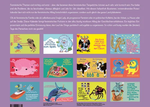 Feministische Themen sind wichtig und ernst – aber, das beweisen diese feministischen Tiergedichte, können auch sehr, sehr komisch sein. Nur leider sind die Probleme, die sie beschreiben, überaus alltäglich und Jahr für Jahr dieselben. Mit diesem farbenfroh illustrierten, immerwährenden Posterkalender lässt sich nicht nur der feministische Alltag fortschrittlich organisieren, sondern auch gleich das ganze Land plakatieren. Ob als feministische Familie oder als selbstbewusste Single Lady, als progressiver Feminist oder im politischen Kollektiv, auf der Arbeit, Zuhause oder auf der Straße: Dieser Kalender bringt feministischen Frohsinn in den allzu häufig trostlosen Alltag der Geschlechterverhältnisse. Ein tägliches Empowerment und die perfekte Erinnerung daran, den Lauf der Dinge paritätisch und egalitär zu organisieren. So schön und lustig wurden die (letzten) Tage des Patriachats noch nie gezählt!