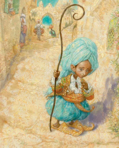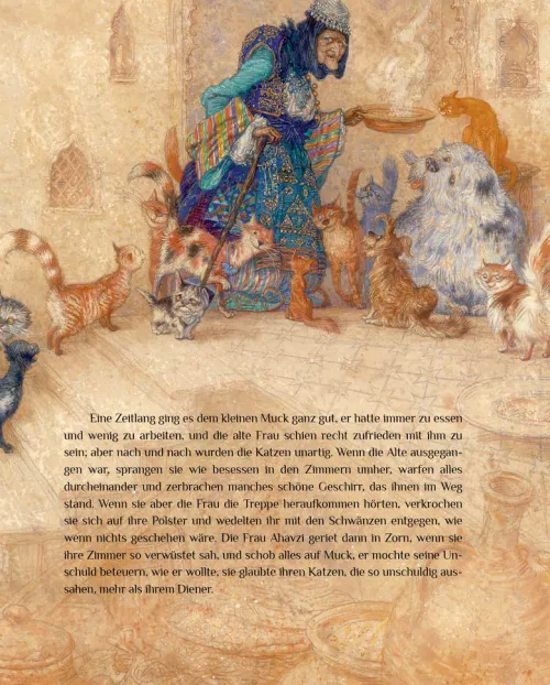 Ein Märchen aus dem Morgenland: In Nicea lebt ein wunderlicher alter Mann. Er ist ein klein und buckligmit einem viel zu großen Kopf und darauf trägt er einen noch größeren Turban. Von den Kindern gehänselt und gejagt, zieht er sie eines Tages mit einer beeindruckenden Geschichtein den Bann – seiner Lebensgeschichte: Es war einmal ein kleiner einfältiger Junge, Muck genannt. Nach dem Tod seines Vaters wird er von den bösen Verwandten aus dem Haus gejagt. Er zieht in die Wüste und hält jede Glasscherbe füreinen Diamanten. . . wie wird er in der Welt bestehen? Wird er in der Fremde sein Glück fnden? Werden ihn vergrabene Schätze, ein geheimnisvoller Feigenbaum und rasende Zauberschuhe an sein Ziel bringen? Wie wird er sich gegen Bosheit und Argwohn wehren? Bilderbuch.