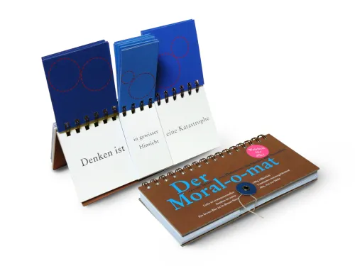 Der Moral-o-mat ist geistreich, überraschend und durch seine drei Blöcke frei kombinierbar. Mit einer Endlosschleife tiefsinniger, gewichtiger und provokanter Thesen über Werte, Normen und Gesellschaft produziert der Moral-o-mat Sätze für die Ewigkeit. Al