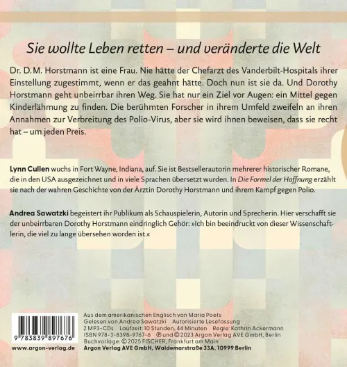 Vanderbilt-Hospital, Nashville 1940: Dr. Dorothy Millicent Horstmann fällt auf unter den Ärzten der Klinik. Sie ist 1, 85 m groß. Und sie ist eine Frau – meistens die einzige im Raum. Dorothy hat Großes vor: Sie will die Kinderlähmung bezwingen, die so viel Leid im ganzen Land verursacht. Zu viele Patienten hat sie in der Eisernen Lunge um Luft ringen und sterben sehen. Dorothy kennt nur ein Ziel: Das Polio-Virus auszulöschen, durch Heilung oder einen Impfstoff. Die berühmten Forscher in ihrem Umfeld zweifeln an ihrer These zur Ausbreitung des Virus im Körper, aber sie wird ihnen beweisen, dass sie recht hat – um jeden Preis.