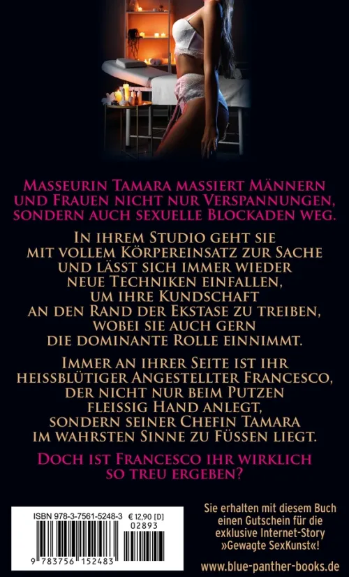 Masseurin Tamara massiert Männern und Frauen nicht nur Verspannungen, sondern auch sexuelle Blockaden weg. In ihrem Studio geht sie mit vollem Körpereinsatz zur Sache und lässt sich immer wieder neue Techniken einfallen, um ihre Kundschaft an den Rand der Ekstase zu treiben, wobei sie auch gern die dominante Rolle einnimmt. Immer an ihrer Seite ist ihr heißblütiger Angestellter Francesco, der nicht nur beim Putzen fleißig Hand anlegt, sondern seiner Chefin Tamara im wahrsten Sinne zu Füßen liegt. Doch ist Francesco ihr wirklich so treu ergeben? Diese Ausgabe ist vollständig, unzensiert und enthält keine gekürzten erotischen Szenen.