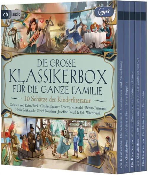 Mit Huckleberry Finn auf dem mächtigen Mississippi reisen, sich mit Jim Hawkins auf die Suche nach einem verborgenen Schatz begeben, mit Phileas Fogg einen atemberaubenden Flug um die Welt wagen oder Alice ins sagenhafte Wunderland begleiten: In dieser Hörbuch-Box lassen Josefine Preuß, Udo Wachtveitl, Heike Makatsch und viele mehr in ihren Lesungen zehn berühmte Klassiker wie »Die Schatzinsel« oder »In 80 Tagen um die Welt« lebendig werden. Ein wahres Hörvergnügen für die ganze Familie!