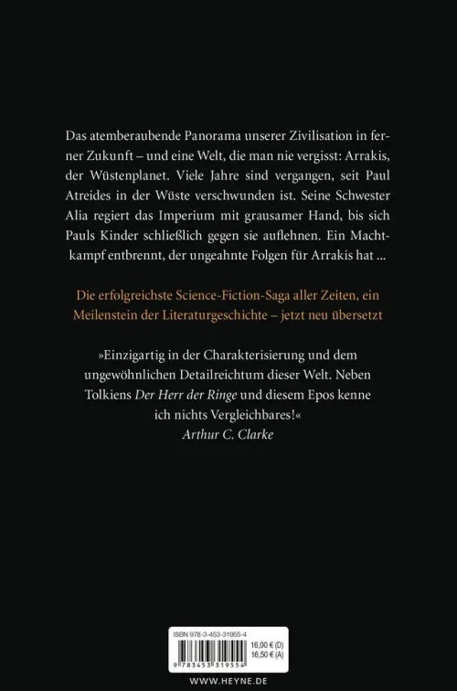 Paul Atreides, der Retter des Wüstenplaneten, ist verschwunden. In seiner Abwesenheit regiert seine Schwester Alia mit immer grausamerer Hand, bis sich schließlich die anderen Kinder von Paul Atreides gegen sie erheben. Doch der Machtkampf hat ungeahnte Folgen für den Planeten und das ganze Sternenimperium . . .