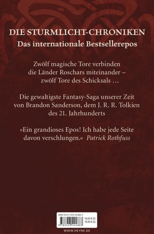 Hoch in den Bergen liegt die sagenumwobene Stadt Urithiru, erreichbar nur über die zwölf Eidtore. Hier versucht die junge Edelfrau Schallan Davar die Geheimnisse der uralten Ordensgemeinschaften zu entschlüsseln, die sich einst die Strahlenden Ritter nannten. Nur mit ihrer Hilfe können die Eidtore benutzt werden, und nur ihre Splitterklingen verleihen den Strahlenden übermenschliche Fähigkeiten. Aber wer waren sie wirklich, und warum wurden sie einst aufgelöst? Während Schallan nach Antworten sucht, die bei der Neugründung der Orden helfen können, begreift Fürst Dalinar, dass seine Vision, die Fürsten des Königreichs Alethkar wieder zu versöhnen, noch viel zu klein gedacht war. Nicht nur die Alethi, sondern alle Völker müssen vereint werden, denn es droht die alles verheerende Wüstwerdung und damit das Ende von ganz Roschar. Doch ein finsterer Schatten liegt auf dieser Hoffnung – Fürst Dalinars eigene, blutbefleckte Vergangenheit . . .