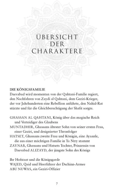 Als Nahri jedoch versehentlich Dara beschwört, einen ebenso gerissenen wie unheimlichen Dschinnkrieger, sieht sie sich gezwungen, ihre Ansichten zu ändern. Denn Dara erzählt ihr von heißen, windgepeitschten Sanddünen, in denen es von Feuerkreaturen wimmelt, von Flüssen, in denen mythische Wesen schlafen, von einstmals großartigen Metropolen, von Bergen, in denen die kreisenden Raubvögel mehr sind, als sie scheinen und er erzählt von der legendären Stadt aus Messing eine Stadt, die eine unwiderstehliche Anziehungskraft auf Nahri ausübt.