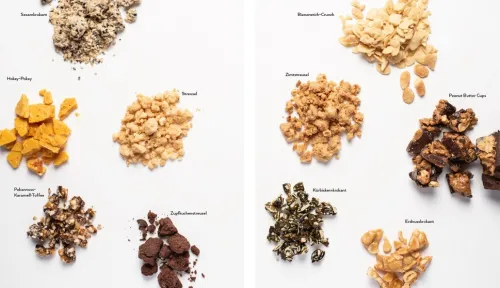 Lucy Allary hat für jeden Geschmack etwas zu bieten! Wie wäre es zum Beispiel mit einem „Brownie Ice Cream Sandwich“ oder „Salty Caramel“? Vielleicht darf es aber auch ein „Haferflocken Zimteis“ oder ein „Chai-Tea-Eis“ sein? Auch Fans von Nüssen kommen auf ihre Kosten: Genießen Sie „Erdnusseis mit Peanut Butter Cups“ oder das unwiderstehliche „Nussnougatcreme-Eis“. Für diejenigen, die es gerne etwas ausgefallener mögen, gibt es das „Florentiner-Eis“, „Marmorkuchen-Eis“ oder das „Kürbiskerneis mit Himbeersauce“. Alle Kaffeeliebhaber werden bei der Sorte „White Coffee“ dahinschmelzen. Wer Klassiker liebt, wird das „Spaghetti-Eis 2. 0“ lieben. Abgerundet wird das Ganze mit leckeren Karamellsaucen, Zitronencreme, Sesamkrokant, gebrannten Mandeln oder Gianduja.