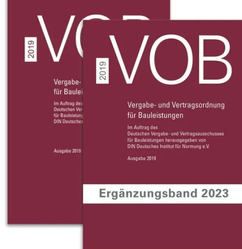 Die VOB Gesamtausgabe 2019 und der Ergänzungsband 2023 sind als Paket erhältlich. Der Ergänzungsband 2023 ergänzt und aktualisiert die derzeit gültige VOB 2019. Die Teile A und B sind unverändert weiterhin anzuwenden. Die neuen und überarbeiteten ATV des Ergänzungsbandes 2023 ersetzen die bisherigen ATV der Gesamtausgabe 2019. Die nicht überarbeiteten ATV der VOB/C der VOB Gesamtausgabe 2019 behalten ihre Gültigkeit.