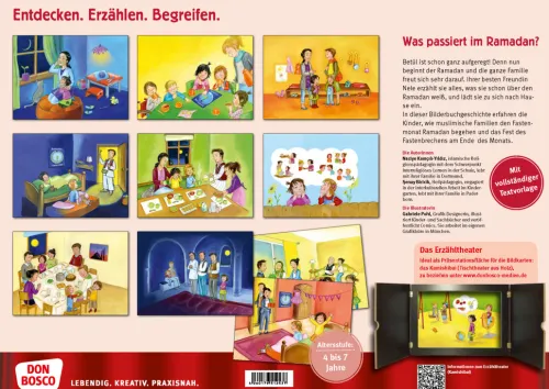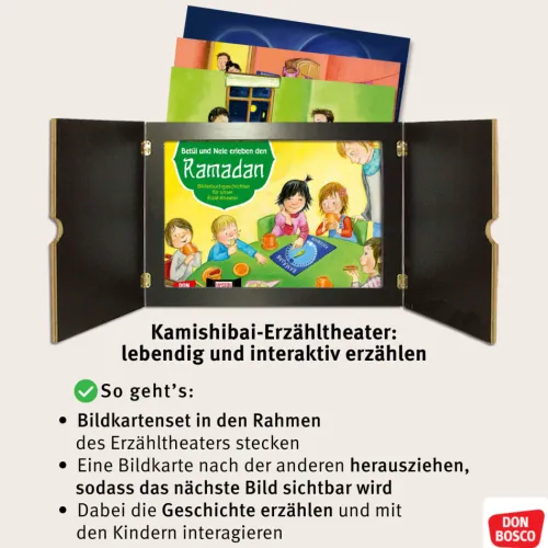 Mitten im bunten Kita-Alltag erzählt Betül ihrer Freundin Nele vom Ramadan – von Ritualen, Fasten, Familientraditionen und dem Zuckerfest. Spielerisch lernen die Kinder, wie muslimische Familien den Fastenmonat gestalten. Das Kamishibai-Bildkartenset bringt interkulturelle Bildung und Religionspädagogik direkt in die Gruppe – kindgerecht, alltagsnah und dialogorientiert.