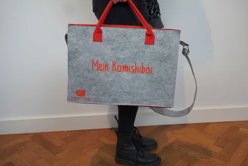 Viele Erzähler:innen lieben ihr Kamishibai so sehr, dass sie es am liebsten überall mit hinnehmen: auf den Kindergeburtstag oder zum Seniorennachmittag, ins Kinderkrankenhaus oder zum Kindergottesdienst, von der Klasse 4a zur Klasse 2b, von der Bücherei in die Kita und in die Eltern-Kind-Gruppe . . . Wir haben unsere schicke Kamishibai-Tasche überarbeitet und mit einem praktischen Extra-Feature ausgestattet! Entscheiden Sie, was bequemer für Sie ist: Halten Sie die Tragetasche mit den zwei Griffen in der Hand. Oder hängen Sie sich die Filztasche mit dem breiten, höhenverstellbaren Gurt über Ihre Schulter.