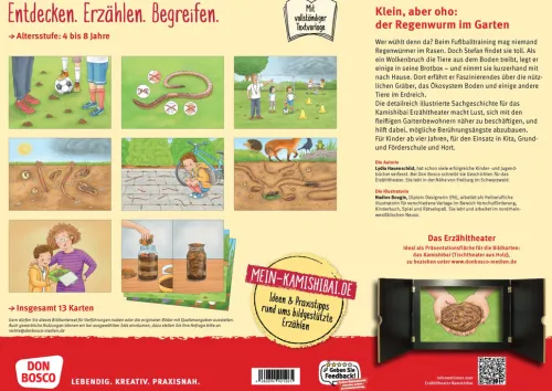Wie findet man einen guten Zugang zum Thema Regenwurm? Am besten gelingt es mit dem Erzähltheater. Aufbau und Funktionsweise des Kamishibai sind denkbar einfach: Die großformatigen Bildkarten werden in den aufstellbaren Rahmen des Erzähltheaters geschoben und nacheinander herausgezogen. Die Art des Vortrags animiert Kinder zwischen 4 und 8 Jahren gleichermaßen zum Zuhören und erleichtert das Verständnis.