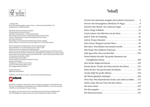 Es war einmal ein Prinz, der den Prinzen seines Herzens suchte, ein Hase mit drei Ohren und eine Königstochter, die lieber Abenteuer erlebte, anstatt zu heiraten. Traditionelle ungarische Märchen neu erzählt das ist die Idee hinter diesem besonderen Kinderbuch . Und so versammelt es 17 fabelhafte Geschichten, in denen ungarische Autor*innen wie Judit B. Tóth, Zoltán Csehy Petra Finy und Dóra Gemesi von diversen Held*innen und ihren märchenhaften Erlebnissen berichten.