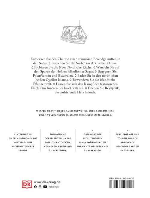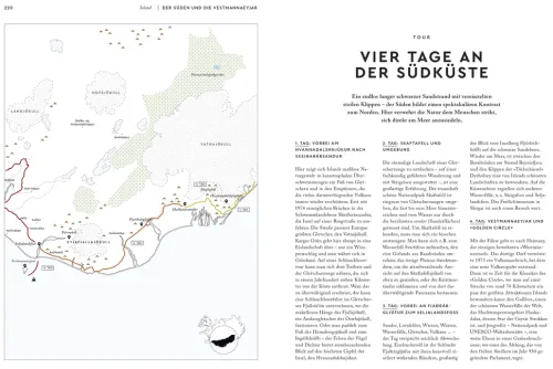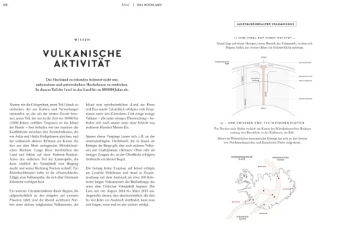 Alle Regionen Islands werden in ihrer Besonderheit vorgestellt, Karten zeigen die wichtigsten Orte: Der energiegeladene Westen mit dem vergletscherten Vulkan Snæfellsjökull, dessen Form ein wenig an Japans Fuji erinnert. Das Land der Wildnis, Die Westfjorde, ein riesiges Plateau, in das einstige Gletscher ein wildes Durcheinander aus tiefen Fjorden gegraben haben. Der Norden, der nur noch einen Katzensprung vom Polarkreis entfernt ist. Das Hochland, die riesige Wildnis, die gänzlich unbewohnt von Menschen ist. Die Ostfjorde, mit seltsamen orangefarbenen Bergen, die über den Meereswellen aufragen. Der Süden mit dem 350 Kilometer langen schwarzen Sandstrand. Und natürlich Reykjavík, die stolze Hauptstadt des Nordens.