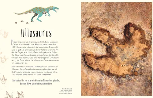 – Beeindruckende visuelle Gestaltung: fantastische Nahaufnahmen, detailreiche Fotografien und stimmungsvolle Illustrationen zeigen beispielsweise die Fußspuren eines Allosaurus, die Schwanzkeule eines Euoplocephalus und den Halswirbel einer Titanoboa.