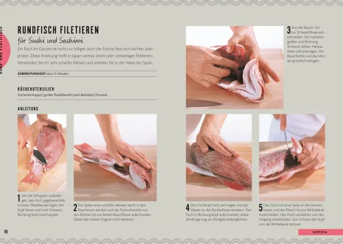 Zum Einstieg zeigen Ihnen die beiden erfahrenen Sushi-Experten Kimiko Barber und Hiroki Takemura die Basics über Warenkunde, Werkzeuge und Küchentechniken. Anschließend erfahren Sie in anschaulichen Stepbildern, wie Sie verschiedene Sushi wie Chirashi, Oshi, Inari, Maki und Nigiri selbst herstellen – egal ob gewickelt, gerollt oder in der Schale serviert.