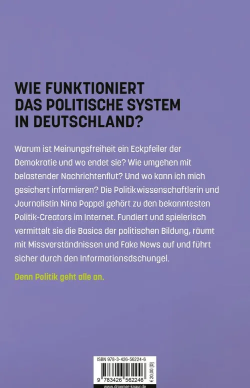 Nina Poppel, einflussreiche Politik-Creatorin auf TikTok und Instagram (@nini_erklärt_politik), gibt in ihrem ersten Sachbuch eine Einführung in das politische Leben und Denken. Sie fängt bei den Basics an und führt dann spielerisch Level für Level durch den komplexen Politik-Dschungel – sie erklärt, wie unser Wahlsystem funktioniert, welche Auswirkungen das Grundgesetz im Alltag hat und wer eigentlich über die Höhe von Steuern entscheidet. Dabei macht sie deutlich, dass Politik nicht nur in Parlamenten und auf internationalen Gipfeln stattfindet, sondern alle betrifft – in unseren Rechten, unseren Entscheidungen und unserer Zukunft.