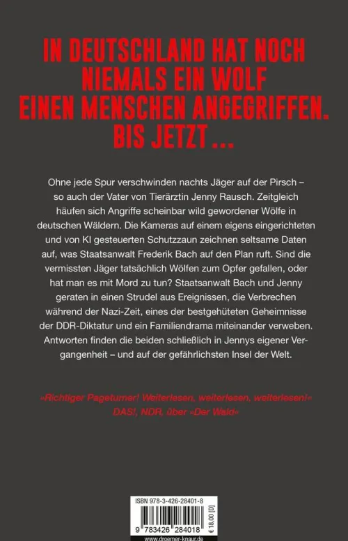 Ohne jede Spur verschwinden nachts Jäger auf der Pirsch – so auch der Vater von Tierärztin Jenny Rausch. Zeitgleich häufen sich Angriffe scheinbar wild gewordener Wölfe in deutschen Wäldern. Die Kameras auf einem eigens eingerichteten und von KI gesteuerten Schutzzaun zeichnen seltsame Daten auf, was Staatsanwalt Frederik Bach auf den Plan ruft. Sind die vermissten Jäger tatsächlich Wölfen zum Opfer gefallen oder hat man es mit Mord zu tun? Staatsanwalt Bach und Jenny geraten in einen Strudel aus Ereignissen, die Verbrechen während der Nazi-Zeit, eines der bestgehüteten Geheimnisse der DDR-Diktatur und ein Familiendrama miteinander verknüpfen. Antworten finden die beiden schließlich in Jennys eigener Vergangenheit – und auf der gefährlichsten Insel der Welt.