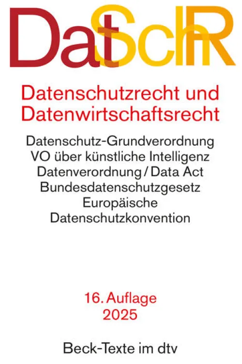 Europäische und nationale Datenschutzvorschriften: Datenschutz-Grundverordnung (VO (EU) 2016/679), JI-Richtlinie (RL (EU) 2016/680), Datenschutzrichtlinie für elektronische Kommunikation (RL 2002/58/EG), Verordnung über künstliche Intelligenz (KI-VO/AI Act – VO (EU) 2024/1689), Gesetz über digitale Dienste (Digital Services Act – VO (EU) 2022/2065), Gesetz über digitale Märkte (Digital Markets Act – VO (EU) 2022/1925), Datenverordnung (Data Act – VO (EU) 2023/2854), Daten-Governance-Rechtsakt (Data Governance Act – VO (EU) 2022/868), Charta der Grundrechte der Europäischen Union, Europäische Datenschutzkonvention (Konvention Nr. 108), Bundesdatenschutzgesetz, Informationsfreiheitsgesetz, Digitale-Dienste-Gesetz, Telekommunikation-Digitale-Dienste-Datenschutz-Gesetz, Telekommunikationsgesetz (Auszug), Telekommunikations-Überwachungsverordnung, Gesetz gegen den unlauteren Wettbewerb (Auszug), Kunsturhebergesetz (Auszug), Grundgesetz (Auszug), Artikel 10-Gesetz, Verwaltungsverfahrensgesetz (Auszug), Strafprozessordnung (Auszug), Strafgesetzbuch (Auszug), Betriebsverfassungsgesetz (Auszug), Handelsgesetzbuch (Auszug), Abgabenordnung (Auszug), Durchführungsbeschluss (EU) 2021/914 über Standardvertragsklauseln für die Übermittlung personenbezogener Daten an Drittländer.