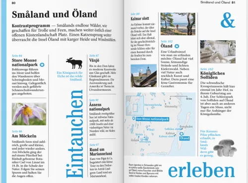 Senkrechtstarter, Überflieger, Querfeldein. Vor Ort die Kapitel: West-Skåne und Halland, Ost-Skåne und Blekinge, Småland und Öland, Gotland, Göteborg und Bohuslän, Vänersee und Dalsland, Vom Vättersee zum Mälarsee, Stockholm und Umland. Das Kleingedruckte (Reiseinfos von A bis Z). Das Magazin.
