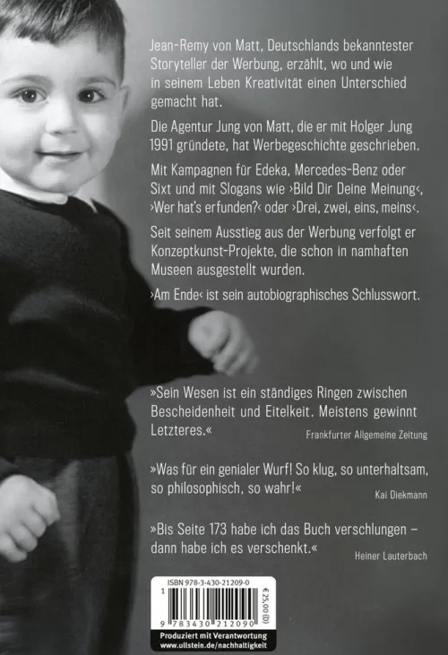 Jean-Remy von Matt singt das Loblied der Kreativität: ein Rohstoff, so kostbar wie verderblich. Das Schießpulver des Kommunikationszeitalters, die Quelle aller Innovation, der Hebel allen Wachstums. Eine unsichtbare Kraft, die in so vielen Lebensbereichen den entscheidenden Unterschied bedeuten kann – wenn Bedenkenträgerei sie nicht ausbremst. Dieses Buch wird von Matts letztes sein – ein unterhaltsames Vermächtnis – am Ende.