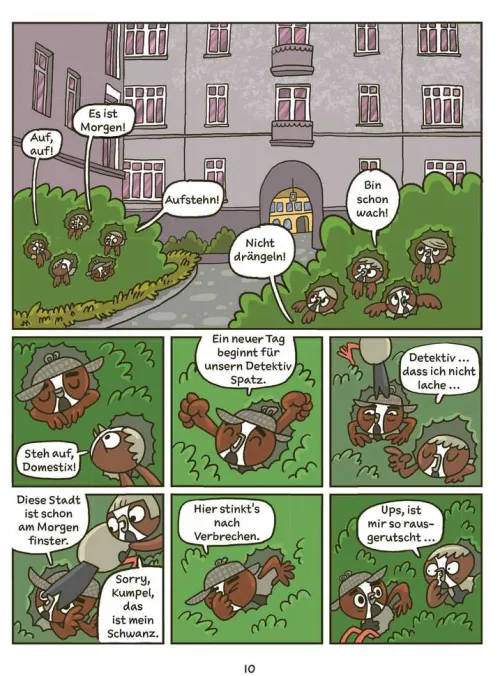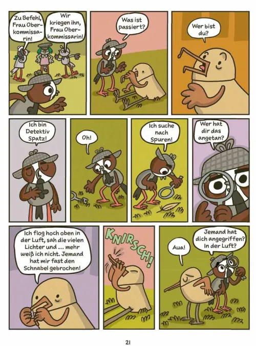 Achtung: Verdächtige Vorkommnisse! Die Spatzen in der Stadt zwitschern, dass Gefahr im Anflug ist: Aus dem Nichts beginnen Vögel vom Himmel zu fallen. Wer greift an: Falke, Krähe, Sperber? Wie findet man den Täter im Großstadtdschungel? Ein Fall für einen echten Detektiv: Detektiv Spatz. Er hat zwar nicht viel Erfahrung, aber jede Menge Motivation. Und er kann auf die Unterstützung von Eule Boreala zählen. Ein Vogel-Comic mit urkomischen Dialogen und Info-Seiten zum Leben von Vögeln in der Stadt.