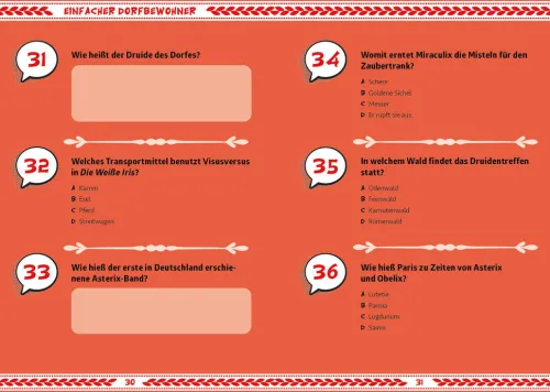 In welchem Band bekommt Obelix zum ersten und einzigen Mal freiwillig Zaubertrank? Wann werden Goethe und Schiller zitiert? Stelle dich dem ultimativen Quiz und rätsle dich durch die verschiedenen Schwierigkeitsstufen. Alle Lösungen sind verschlüsselt und können nur mit der Decoderfolie zum Vorschein gebracht werden. So ist Schummeln ausgeschlossen! Spannender Rätselspaß für alle Asterix-Fans!