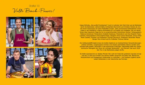 Deutschlands beliebteste TV-Backshow feiert großes Jubiläum: Stets äußerst charmant begleitet von Enie van de Meiklokjes kürt die Jury aus Bettina Schliephake-Burchardt und Christian Hümbs bereits zum 10. Mal den/die beste Promibäcker*in Deutschlands. Das will gebührend gefeiert werden!