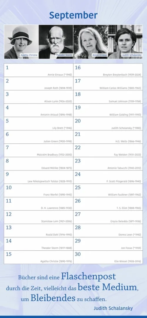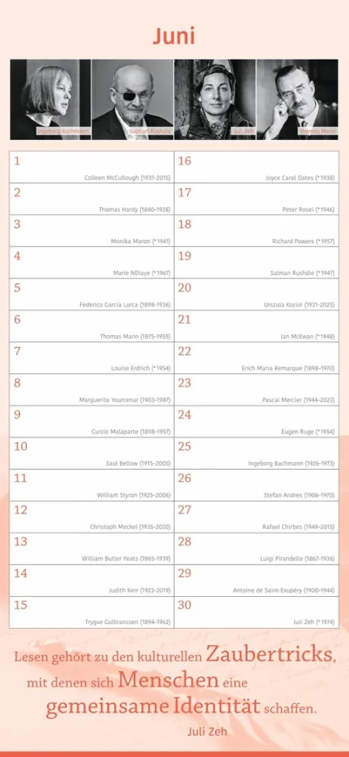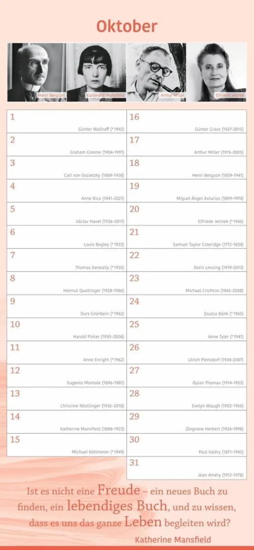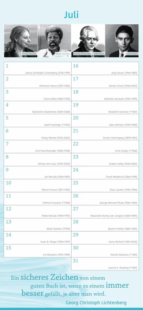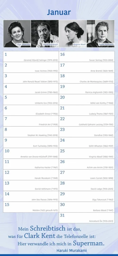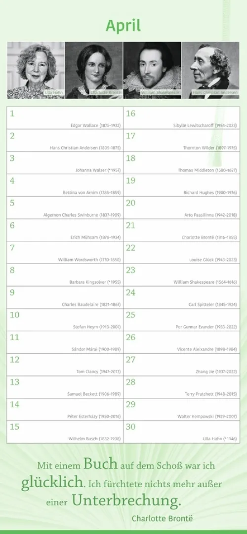 – Keinen Geburtstag von Familie und Freunden mehr vergessen: immerwährender Kalender mit Platz für eigene Eintragungen – ohne Jahreszahl, unbegrenzt nutzbar- Kalendarium mit einem literarischen Geburtstagskind pro Tag: Autor:innen, Schriftsteller:innen und Literat:innen- Geburtstagskind des Monats – Januar bis Dezember Porträts in Bildern und Worten- Inspirierende Zitate und literarische Worte aus der Welt der Literatur- Hochwertiger Wandkalender im länglichen Format (16 × 34, 7 cm) – ideal für Küche, Büro oder Arbeitszimmer- Literarische Kalender für die schönen Seiten des Lesens: Die edition momente im Athesia Kalenderverlag