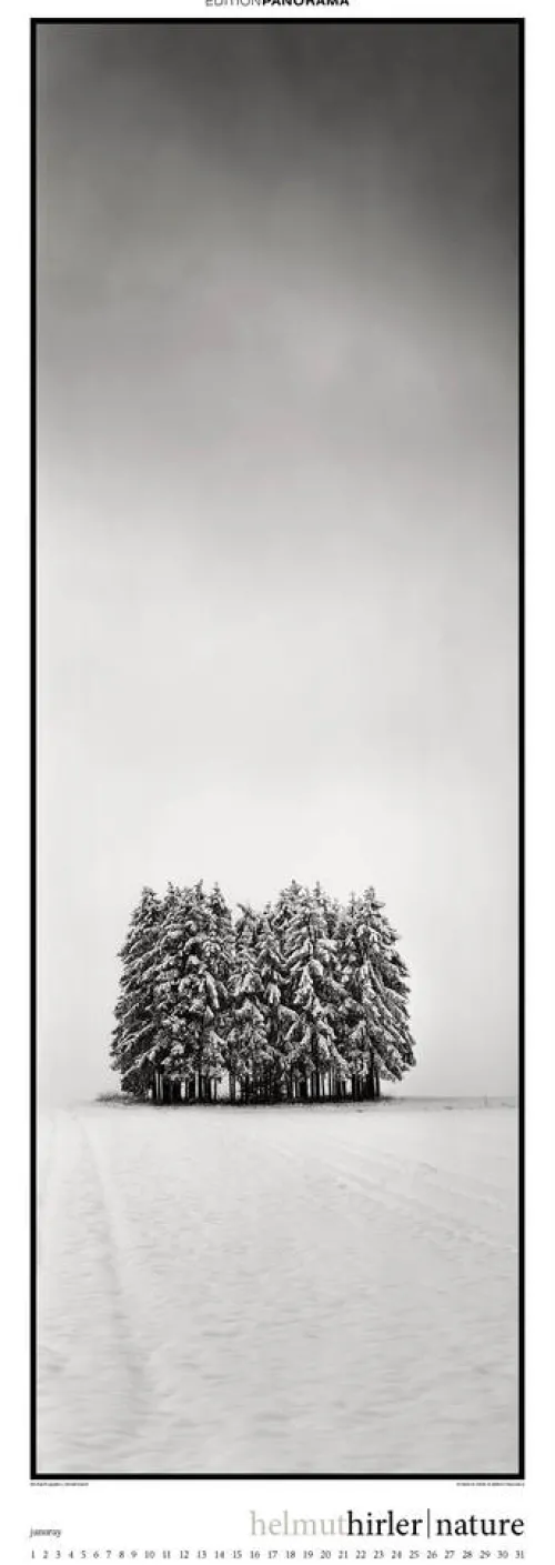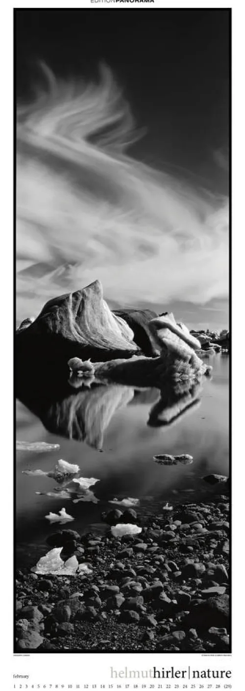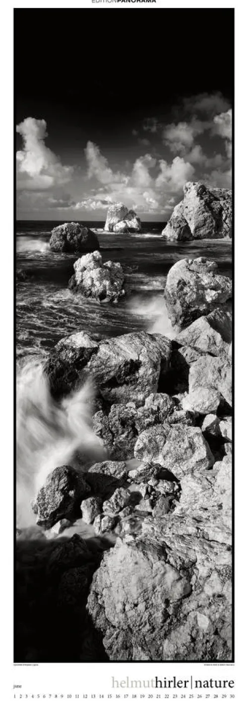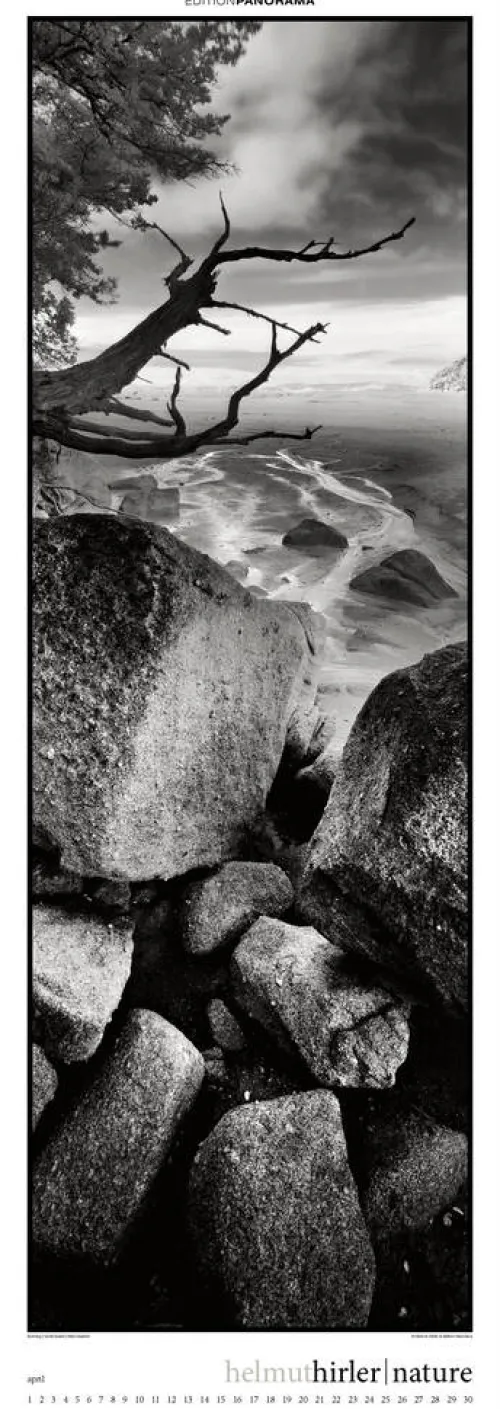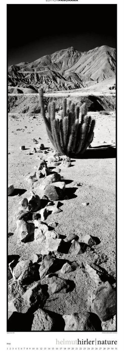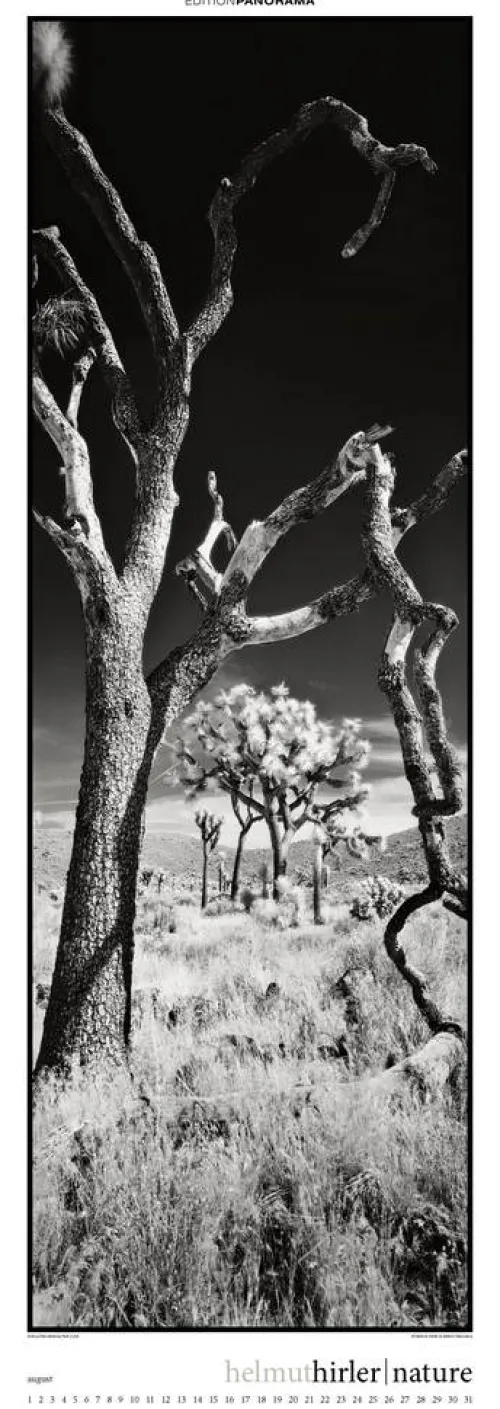 Ein vertikaler Kalender mit Infrarotaufnahmen in Schwarz-Weiß mit Landschaften aus aller Welt: