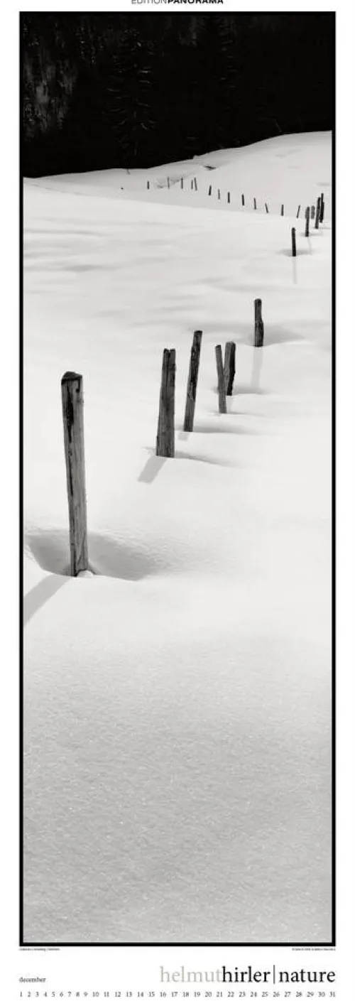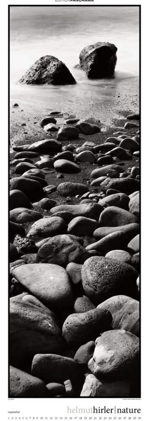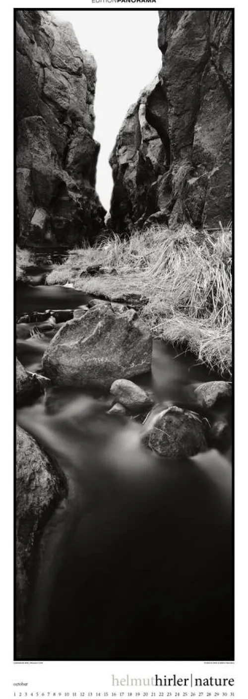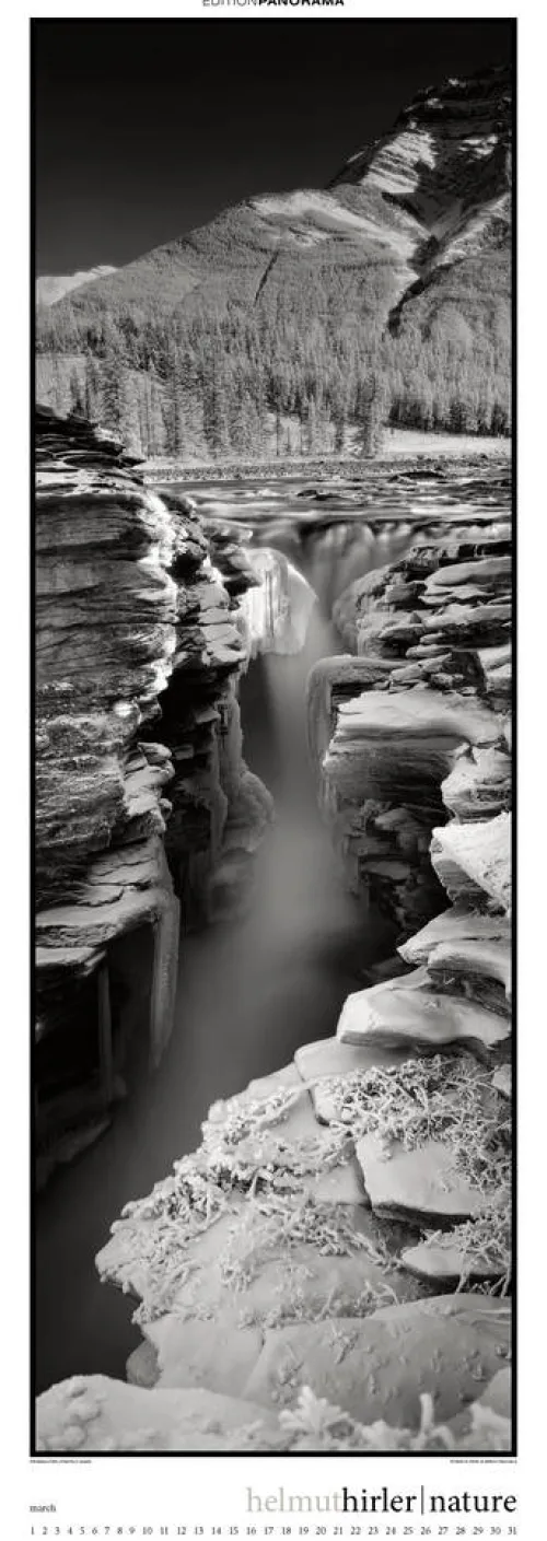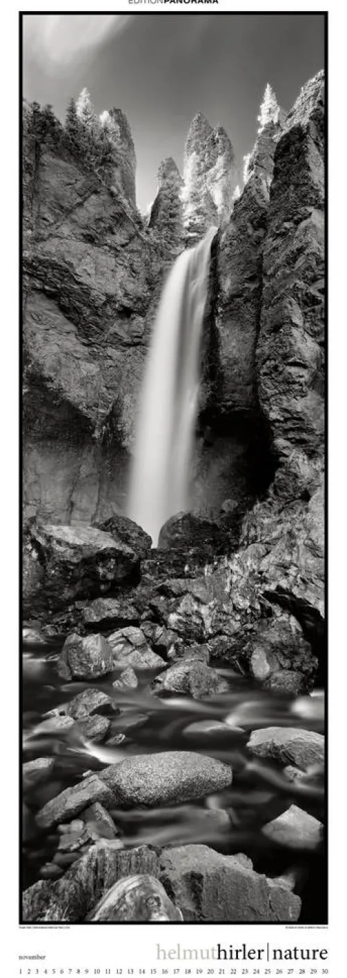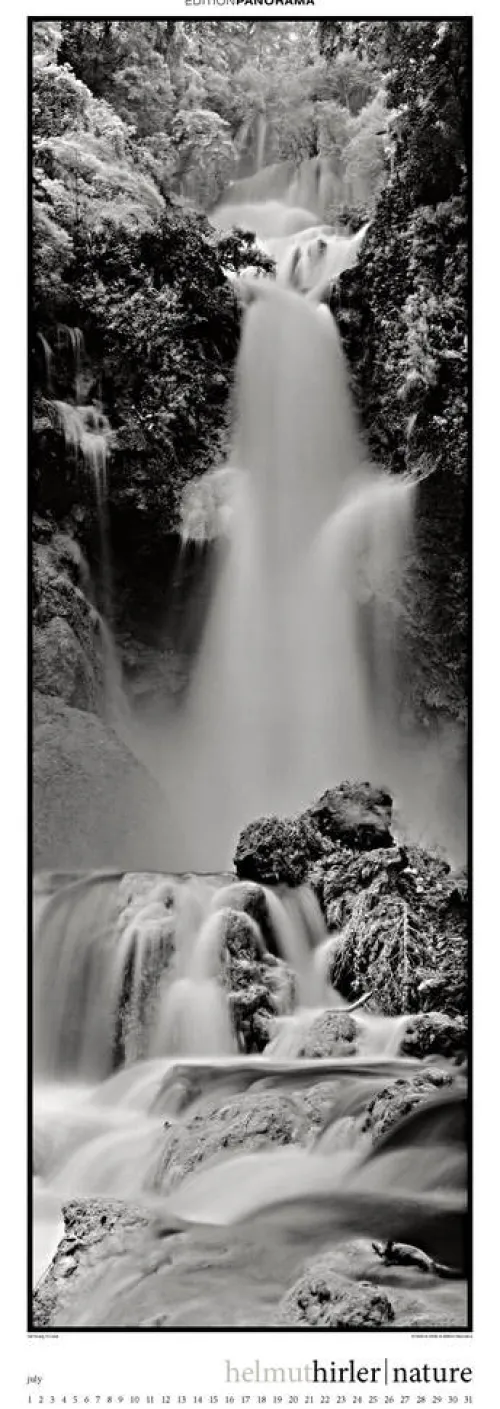 Ein vertikaler Kalender mit Infrarotaufnahmen in Schwarz-Weiß mit Landschaften aus aller Welt: