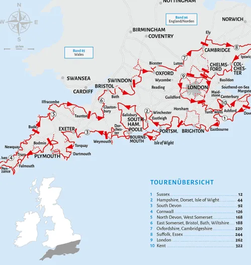 TourenkartenAuf rund 4000 km in 9 Touren zu allen großen Attraktionen und weniger bekannten Orten reisen. Genaue Markierung freier Stell-, Bade-, Picknick-, Wander- und Campingplätze incl. Ausstattung. Einzeichnung von Museen, Burgen, Herrenhäusern, Kirchen uvm. Natur erleben, wandernWandern auf den Küstenpfaden Cornwalls, spazieren auf stillen Wegen im Landesinneren oder die großartigen englischen Gärten erkunden. Naturreservate, Wälder, Rhododendronhaine, Moore und Schilfgürtel erforschen. Dabei nach seltenen Vögeln und Robben Ausschau halten. Kulturschätze, StädteHerrschaftssitze des englischen Landadels, Burgenrelikte aus der Zeit Heinrichs VIII. und quirlige Städte für jeden Geschmack, wie Brighton, Bristol, Bath und Norwich. Altehrwürdige Universitätssitze wie Oxford und Cambridge. Und natürlich London, eine der aufregendsten Metropolen der Welt. Wasser erleben, badenFelsküsten mit mediterran anmutenden, traumhaft schönen Buchten im Westen, von Sanddünen gesäumten Gezeiten-Strände im Osten und spektakuläre Kreidefelsen an Englands Südküste – beim Baden, Wassersport oder „Rockpooling“ findet jeder seinen Lieblingsort an der See. WOMO-ServiceWir vermerken über 300 Plätze zum bequemen Übernachten mit Anfahrtsbeschreibung und präzisen GPS-Koordinaten. Wo vorhanden führen wir die jeweiligen Ausstattungen wie z. B. Ver-/Entsorgung/WC etc. auf. Wir geben Hinweise zu Tagesparkplätzen in Städten, zu Sehenwürdigkeiten und Straßenzuständen.