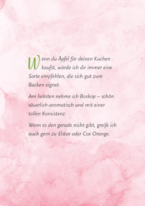 Enthalten sind schnelle Ideen wie der Apfel-Becherkuchen oder ein saftiger Schokoladenkuchen, cremige Käsekuchen in vielen Variationen sowie Klassiker wie Butterkuchen, Marmorkuchen oder Donauwelle. Für besondere Anlässe gibt es außerdem Rezepte wie die Windbeutel-Torte, eine Ananas-Kokos-Schnitte, die Frau-Holle-Torte oder den Smash Cake zum ersten Geburtstag.