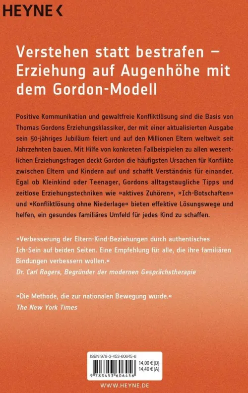 Positive Kommunikation und gewaltfreie Konfliktlösung sind die Basis von Thomas Gordons Erziehungsklassiker, der mit einer aktualisierten Ausgabe sein 50-jähriges Jubiläum feiert und auf den Millionen Eltern weltweit seit Jahrzehnten bauen. Mit Hilfe von konkreten Fallbeispielen zu allen wesentlichen Erziehungsfragen deckt Gordon die häufigsten Ursachen für Konflikte zwischen Eltern und Kindern auf und schafft Verständnis für einander. Egal ob Kleinkind oder Teenager, Gordons alltagstaugliche Tipps und zeitlose Erziehungstechniken wie »aktives Zuhören«, »Ich-Botschaften« und »Konfliktlösung ohne Niederlage« bieten effektive Lösungswege und helfen, ein gesundes familiäres Umfeld für jedes Kind zu schaffen.