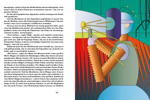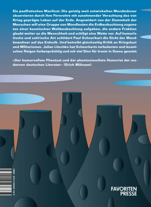 Die geistig weit entwickelten Mondmänner studieren mit ihren Fernrohren das Geschehen der umliegenden Sterne. Sie beobachten auch die Menschen, jedoch mit zunehmender Verachtung, da das Leben auf der Erde geprägt ist von Krieg und gegenseitiger Vernichtung. Die Mondbevölkerung spaltet sich in zwei Parteien. Eine konservative, die die Beobachtung der Erde weiter aufrechterhalten will und eine Partei, die so angewidert ist von der Brutalität der Menschen, dass sie die Beobachtung aufgeben will. Eine Wette soll über die zukünftige Beobachtung der Erde entscheiden. Paul Scheerbarts phantastischer Roman schildert das Leben auf dem Mond und die Sicht der Mondbewohner auf das Erdvolk auf humoristische und satirische Art und Weise. Gleichzeitig betreibt er Kritik am Militarismus der Menschen. Scheerbarts literarisches Werk wird wunderbar von Julian Litschkos leuchtenden und lebhaften Illustrationen wiederbelebt und von Erich Mühsam eingeleitet.