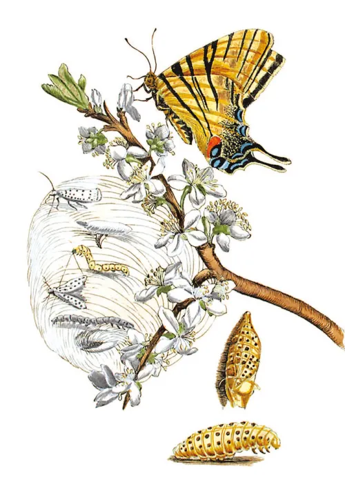 Das Werk mit seinen genauen Beschreibungen gilt heute als ein Pionierwerk der Entomologie, die in aufwendigem Verfahren von Merian handkolorierten Kupferstiche zeigen heimische Bäume, Sträucher und Blumen sowie die damals noch namenlosen Raupen und Schmetterlinge. Das ursprünglich in zwei Teilen publizierte Werk erscheint nun in einem Prachtband.