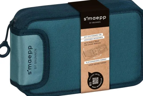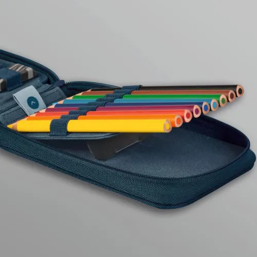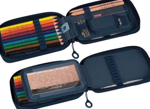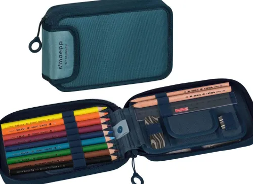 B/H/T: 200×125×45 mm, Kunstfaser, Farbe: denim, Inhalt: 9 dicke Markenbuntstifte, 2 Markenbleistifte, Lineal 16 cm, Metalldoppelspitzer, Radiergummi, Geldfach mit Klettverschluss, Stundenplan, Zeichenschablone, innovative Stifterampe für leichteres Entnehmen, horizontales Öffnen spart Platz auf dem Schreibtisch, mit ergonomischem Zipper für müheloses Öffnen und Schließen Kunstfaser, B/H/T: 200×125×45 mm.