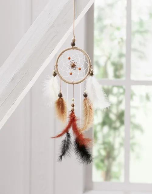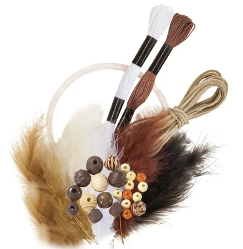 Enthält: 1 Mobilering DM 12 cm, 2 Baumwollgarn weiß/braun je 8 m, 1 Kunstlederband beige 3, 5 m, 10 Flauschfedern farbig sortiert, 21 Holzperlen farbig sortiert, 1 Anleitung, Garn
