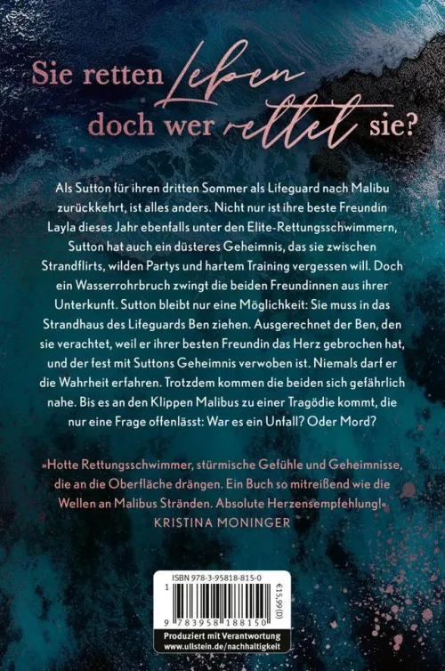 „Hotte Rettungsschwimmer, stürmische Gefühle und Geheimnisse, die an die Oberfläche drängen. Ein Buch so mitreißend wie die Wellen an Malibus Stränden. Absolute Herzensempfehlung!“ Kristina Moninger