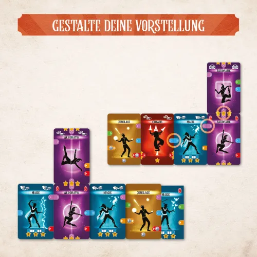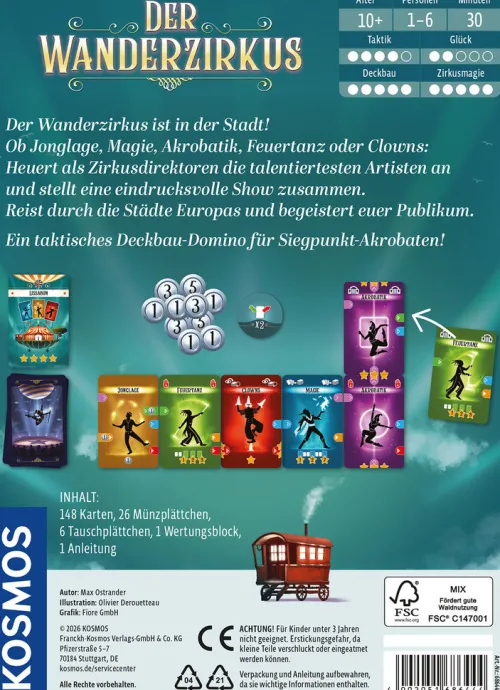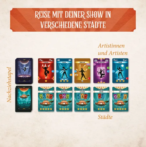 Ein farbenfrohes Zirkuserlebnis: taktisches Deckbau-Kartenspiel voller ReisestimmungDer Wanderzirkus tourt durch Europa und stellt in jeder Stadt eine neue Vorstellung zusammen. Das Kartendeck wächst von Runde zu Runde, indem immer neue Artisten angeworben und in zukünftige Shows integriert werden. Farbige Verbindungen, unterschiedliche Artistenfähigkeiten und taktische Reihenfolgen sorgen für abwechslungsreiche Vorstellungen. Klare Abläufe ermöglichen einen leichten Einstieg, während wechselnde Städte, Kartenkombinationen und Entscheidungen jedes Spiel abwechslungsreich machen. Mit Solo-Modus, Profi-Variante und Runden für ein bis sechs Personen: flexible Spielweisen und Herausforderungen für verschiedene Erfahrungsniveaus. Der Zirkus ist in der Stadt! Der Wanderzirkus entführt in diesem Deckbau-Spiel in eine zauberhafte Welt voller einzigartiger Artistinnen und Artisten. In jeder Runde wird sowohl die Stadt gewählt, in der der eigene Zirkus als Nächstes gastiert, als auch eine neue Attraktion. Für jede Vorstellung muss auch eine Mindestanzahl von Artistinnen und Artisten festgelegt werden, die bei Erreichen Punkte bringt. Dann startet die Show! Dafür legen die ein bis sechs Spielerinnen und Spieler ihre Karten nach dem Domino-Prinzip aneinander, um lange und punkteträchtige Ketten zu bilden. Im taktischen Kartenspiel ab zehn Jahren warten wundersame und spannende Wendungen: Wer sammelt die meisten Punkte und stellt die beste Zirkus-Show auf die Beine?